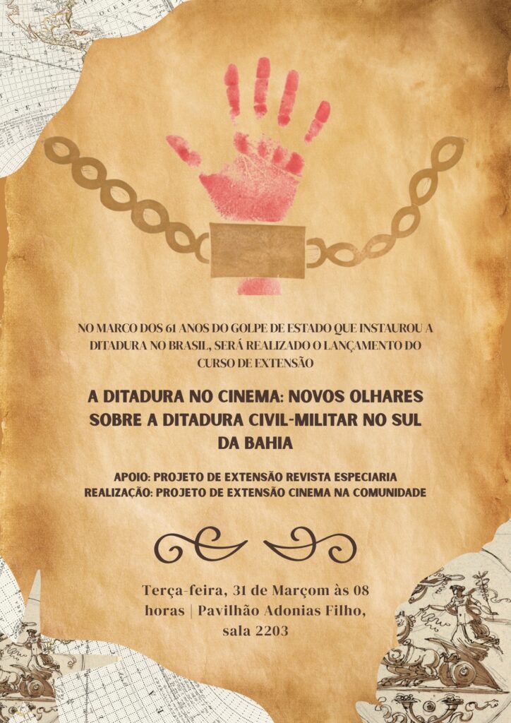 O evento será às 08h, na sala 2203, no 2º andar do Pavilhão Adonias Filho, e contará com um debate sobre o filme após a sessão. A proposta do curso é promover uma análise crítica do período da ditadura e dos seus impactos, a partir da linguagem cinematográfica.