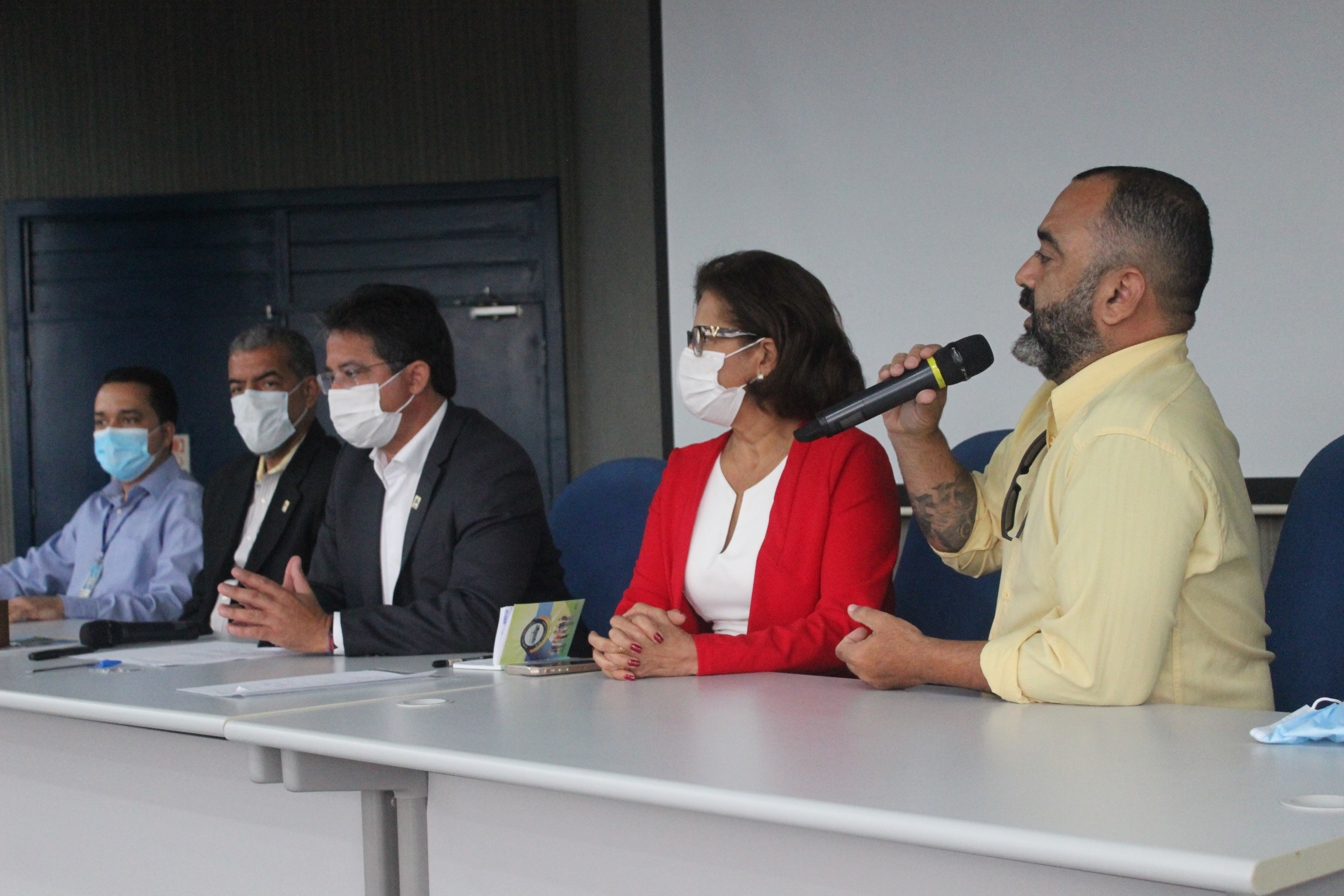 Na solenidade, o presidente da ADUSC Marcelo Lins compôs a mesa como representante do sindicato, ao lado do Reitor Alessandro Fernandes, do Vice-Reitor Maurício Moreau, da Pró-Reitora de graduação Rosenaide Ramos e do Gerente de Recursos Humanos Luciano Farias.
